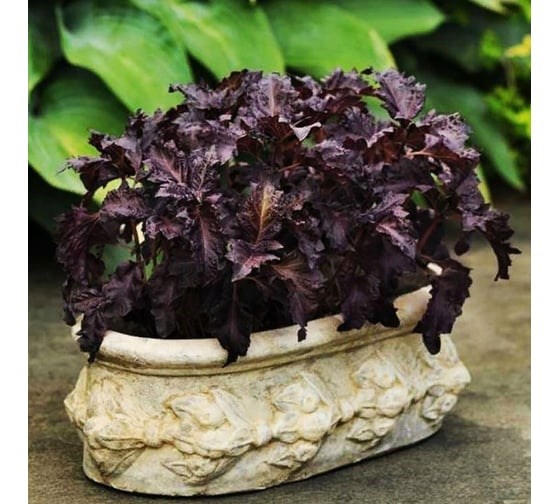Базилик декоративный Пёпл Рафлс F1. Привлекательные гофрированные овальные листья базилика остаются темно-фиолетовыми на протяжении всего сезона. Этот сорт базилика отличается от других садовых растений своей тонкой текстурой и изысканной листвой.