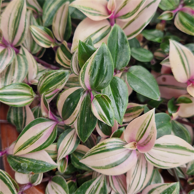 Вариегатность этой традесканции очень индивидуальная, она переходит от абсолютно нежно розовых побегов, до зелёных, полосатых, с жёлтыми и розовыми полосками и чётко половинчатыми расцветками листьев, очень густая пышная, супер короткие междоузлия, не слишком быстро разростается.